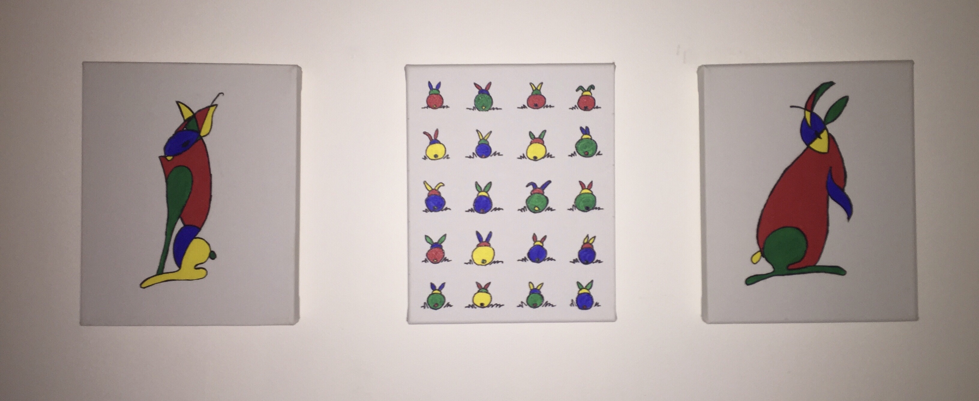 Three paintings in my rabbit series, developed from some work I did in high school and first year uni. (Acrylic on canvas, 10×8”).