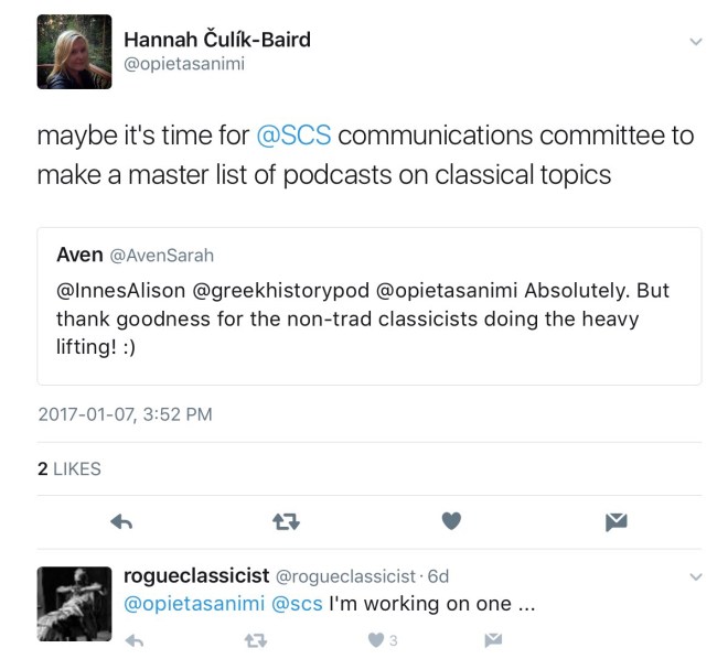 The suggestion was made on Twitter that the SCS could support podcasting efforts by keeping a list on their website of Classics podcasters. As an independent podcaster, I have mixed feelings about this. I certainly welcome support and the idea of having a list to make it easier to find Classics podcasting is definitely useful and appealing.