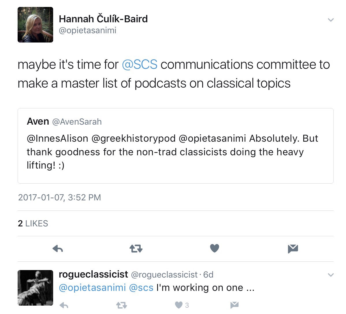 The suggestion was made on Twitter that the SCS could support podcasting efforts by keeping a list on their website of Classics podcasters. As an independent podcaster, I have mixed feelings about this. I certainly welcome support and the idea of having a list to make it easier to find Classics podcasting is definitely useful and appealing.