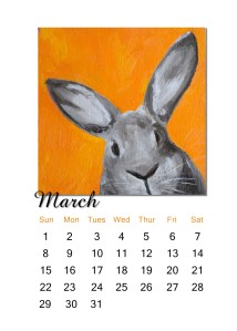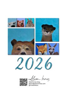 Custom designed 5 x 7″ (vertical) calendar featuring 12 original paintings: bear, raccoon, fox, marmot, otter, polar bear, bunny, sloth, cat.