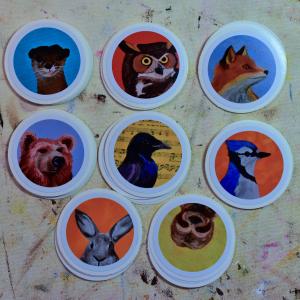 Die-cut 2″ round stickers featuring 8 popular designs: otter, owl, fox, bear, crow, blue jay, bunny, sloth. Printed locally.