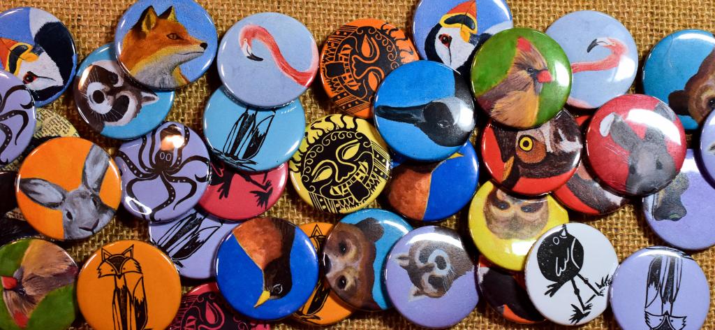 Limited edition 1.5″ round pin back buttons featuring original oil paintings and lino prints: