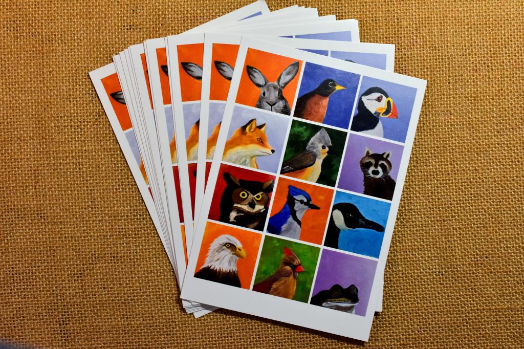 Collage of 12 popular paintings (bunny, robin, puffin, fox, tufted titmouse, raccoon, great horned owl, blue jay, Canada goose, bald eagle, female northern cardinal, toad) on a 5×7″ postcard. Suitable for framing.